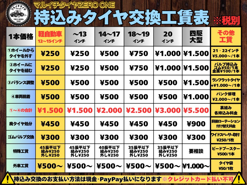 ※持ち込みタイヤ交換のお支払いはすべて現金一括もしくはPayPayでのお支払でお願いいたします。