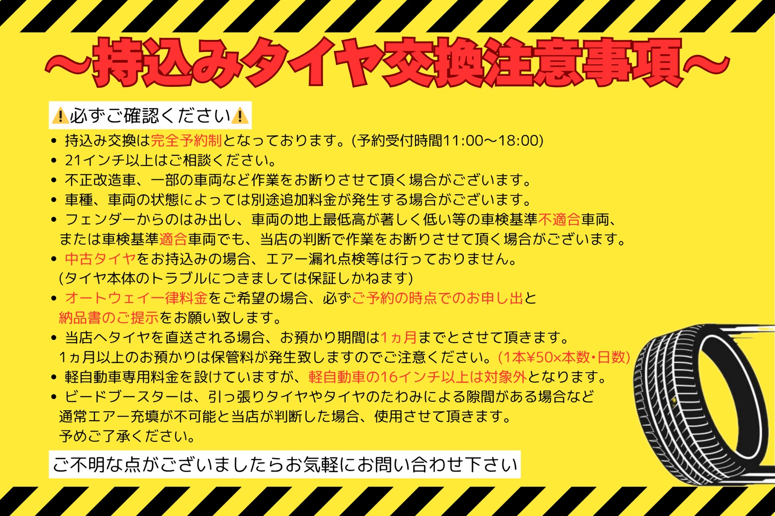 料金のお見積もりやタイヤ交換の予約なども歓迎いたします。またお急ぎの場合は営業時間内(10:00~19:00)に店舗までお電話いただけますようよろしくお願いします。